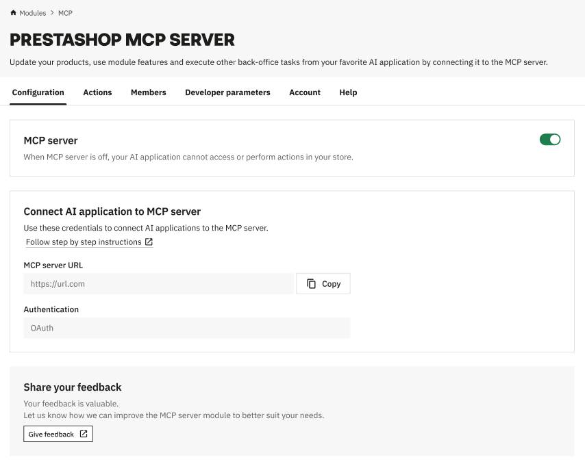 You can find and copy the URL of the server necessary to connect AI applications to the PrestaShop MCP Server.