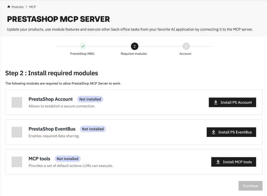 PrestaShop MCP Server requires additional PrestaShop modules to function: PrestaShop Marketplace in the Back Office and PrestaShop Account.