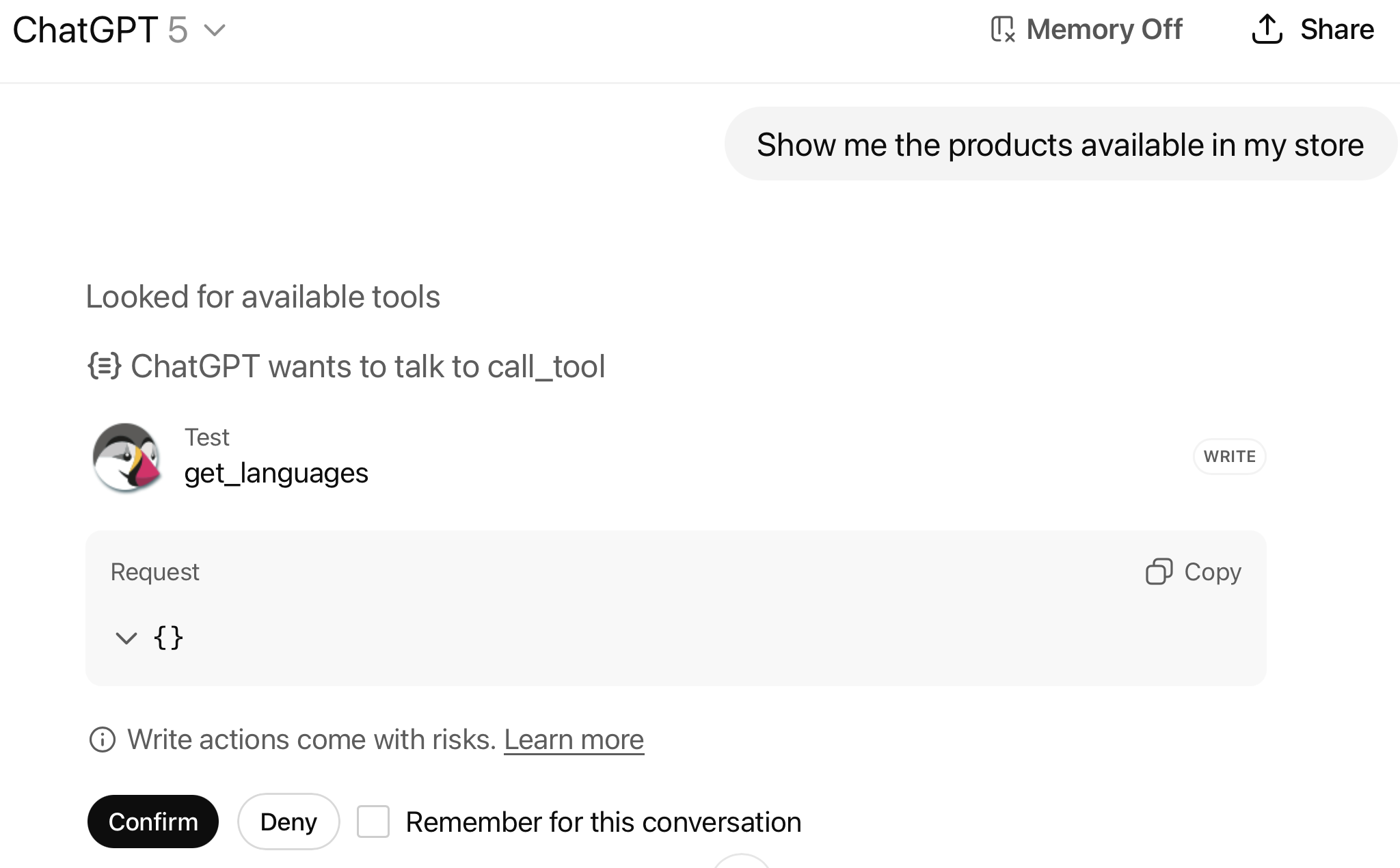 ℹ️ In ChatGPT, the PrestaShop connector must be added manually to each new conversation, which can easily be forgotten.