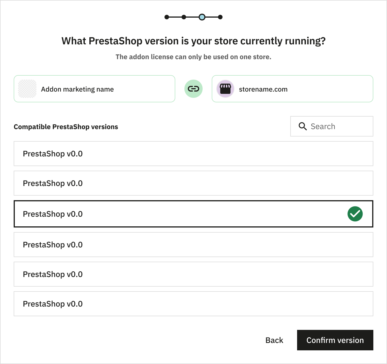 - Asoció el módulo a la tienda en la que desea instalarlo para acceder a la descarga. Indique la URL de su tienda de producción. No indique su URL de prueba aquí. Vincule la licencia a la producción. Podrá instalar el mismo archivo ZIP en sus entornos de prueba.