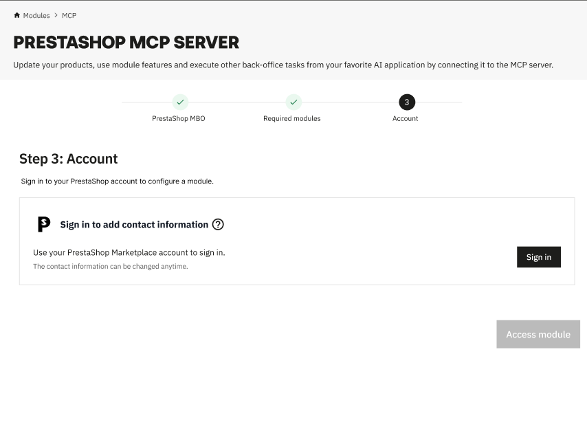El servidor MCP de PrestaShop requiere otros módulos de PrestaShop para funcionar: PrestaShop Marketplace en el Back Office y PrestaShop Account.