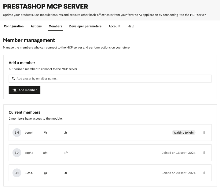 Un usuario debe estar autorizado en la pestaña Miembros de PrestaShop MCP Server para conectarse al servidor MCP.